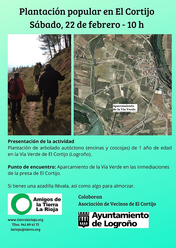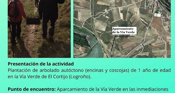 Plantación de arbolado autóctono (encinas y coscojas de 1 savia) en la Vía Verde de El Cortijo (Logroño) con la colaboración del Ayuntamiento de Logroño y la Asociación de Vecinos de El Cortijo. Las plantas han sido cedidas por el Gobierno de La Rioja de forma gratuita a esta asociación para la realización de la presente actividad. Proceden de los viveros de la CCAA de La Fombrera (Logroño).